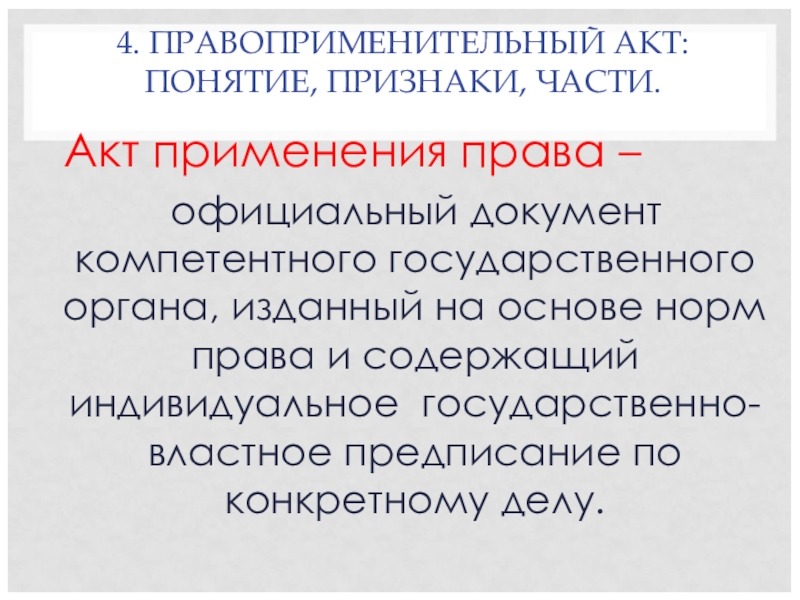 4. ПРАВОПРИМЕНИТЕЛЬНЫЙ АКТ: ПОНЯТИЕ, ПРИЗНАКИ, ЧАСТИ.