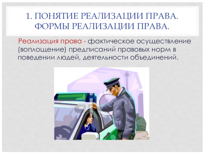 Слайд 21. ПОНЯТИЕ РЕАЛИЗАЦИИ ПРАВА. ФОРМЫ РЕАЛИЗАЦИИ ПРАВА.