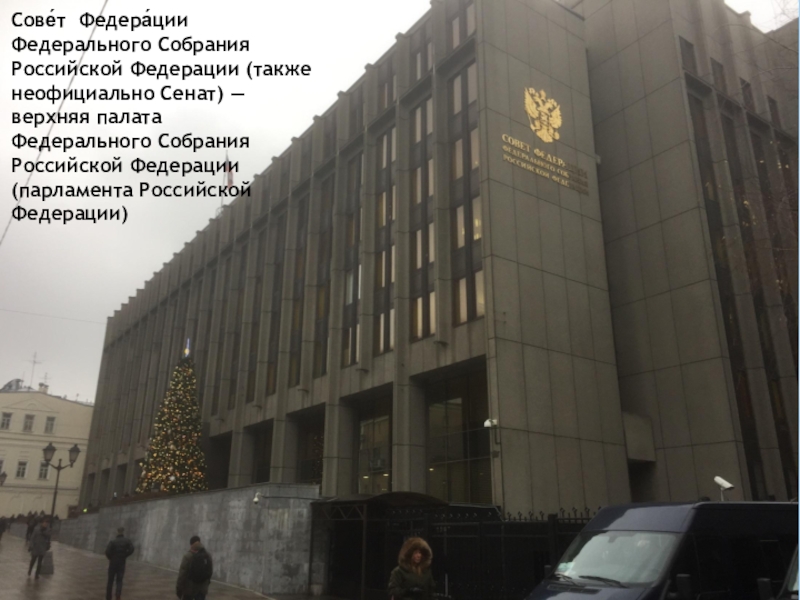 Слайд 2Сове́т Федера́ции Федерального Cобрания Российской Федерации (также неофициально Сенат) — верхняя палата