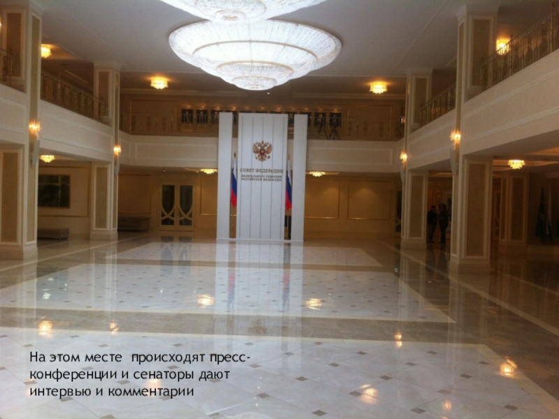 Слайд 12На этом месте происходят пресс-конференции и сенаторы дают интервью и комментарии