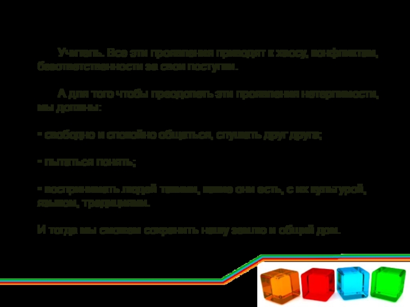 А для того чтобы преодолеть эти проявления нетерпимости, мы должны: