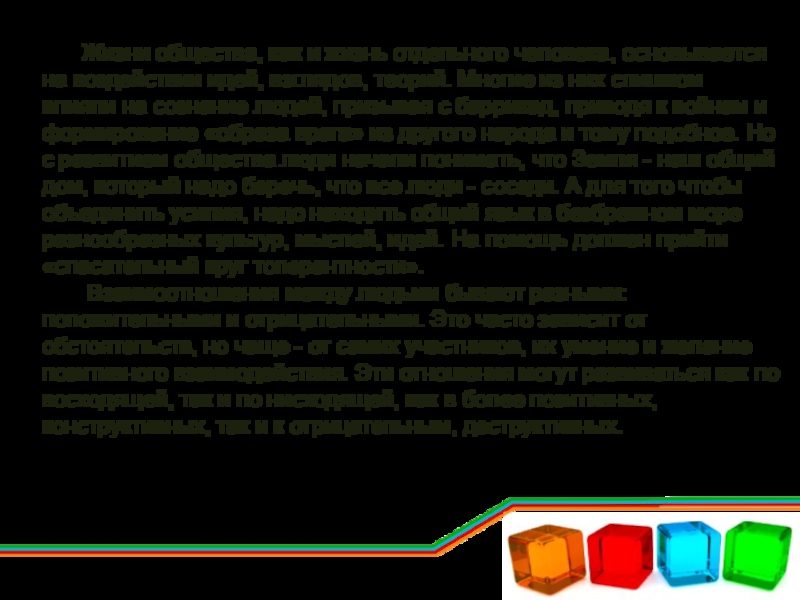 взглядов, теорий. Многие из них слишком влияли на сознание людей, призывая с баррикад, приводя к войнам и формирование «образа врага» из другого народа и тому подобное. Но с развитием общества люди начали понимать, что Земля - наш общий дом, который надо беречь, что все люди - соседи. А для того чтобы объединить усилия, надо находить общий язык в безбрежном море разнообразных культур, мыслей, идей. На помощь должен прийти «спасательный круг толерантности».
