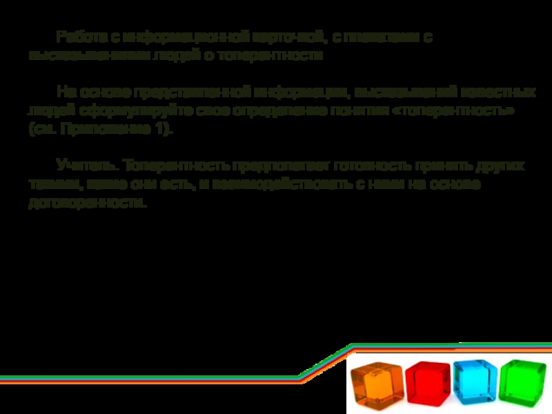 Слайд 13 Работа с информационной карточкой, с плакатами с высказываниями людей о толерантности