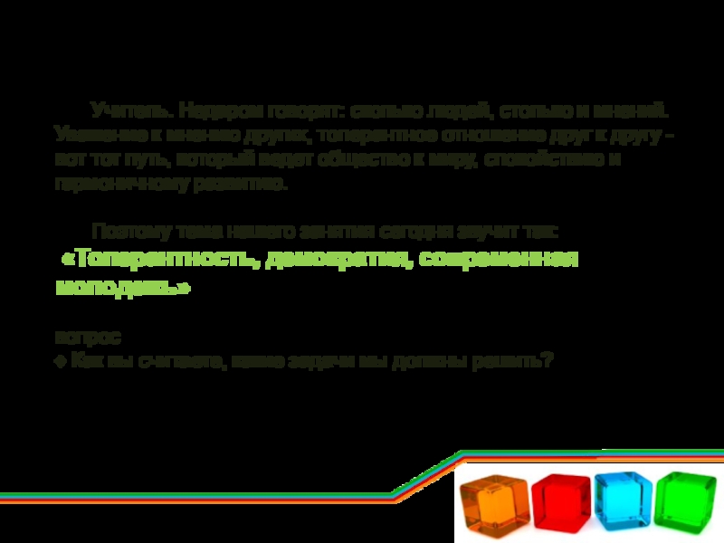 мнению других, толерантное отношение друг к другу - вот тот путь, который ведет общество к миру, спокойствию и гармоничному развитию.