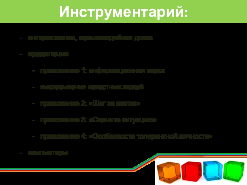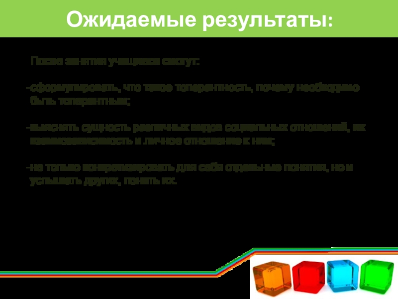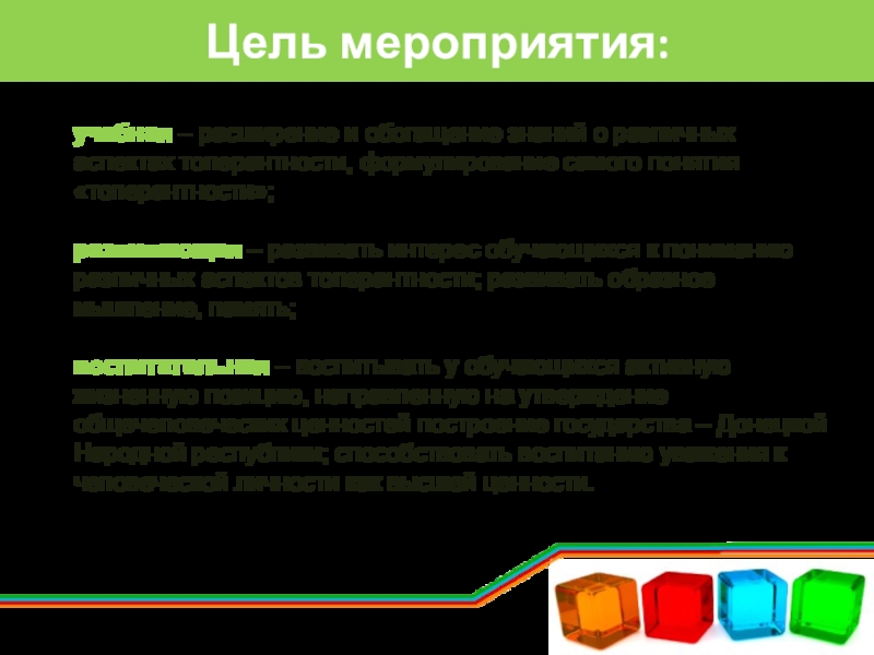 развивающая – развивать интерес обучающихся к пониманию различных аспектов толерантности; развивать образное мышление, память;
