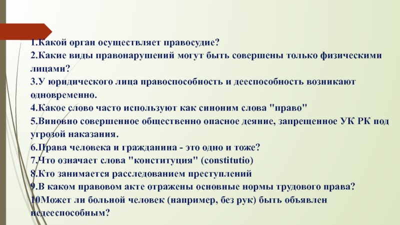 1.Какой орган осуществляет правосудие? 2.Какие виды правонарушений могут быть совершены только физическими лицами? 3.У юридического лица правоспособность и дееспособность возникают одновременно. 4.Какое слово часто используют как синоним слова "право" 5.Виновно совершенное общественно опасное деяние, запрещенное УК РК под угрозой наказания. 6.Права человека и гражданина - это одно и тоже? 7.Что означает слова "конституция" (constitutio) 8.Кто занимается расследованием преступлений 9.В каком правовом акте отражены основные нормы трудового права? 10Может ли больной человек (например, без рук) быть объявлен недееспособным?
