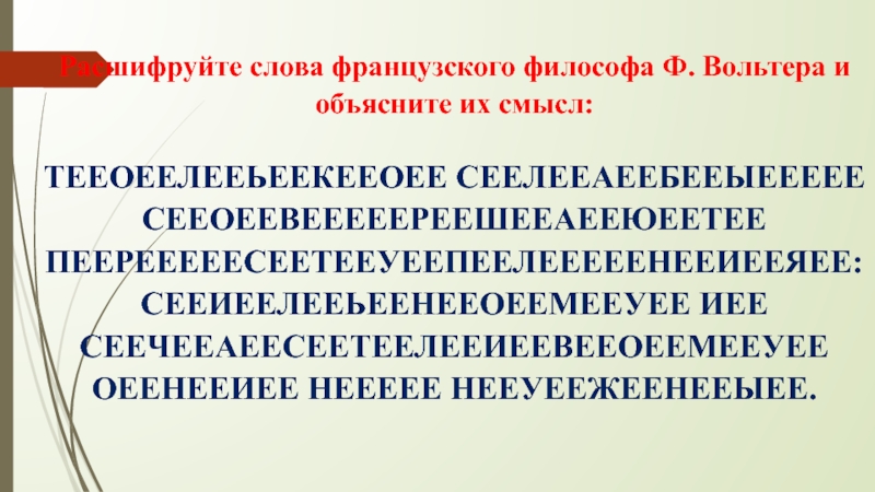 Слайд 7Расшифруйте слова французского философа Ф. Вольтера и объясните их смысл: ТЕЕОЕЕЛЕЕЬЕЕКЕЕОЕЕ СЕЕЛЕЕАЕЕБЕЕЫЕЕЕЕЕ