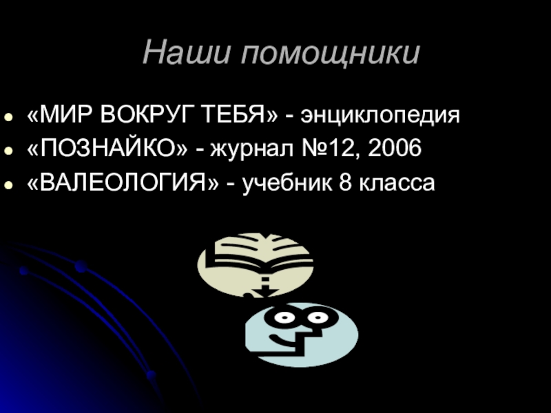 Наши помощники «МИР ВОКРУГ ТЕБЯ» - энциклопедия«ПОЗНАЙКО» - журнал №12, 2006«ВАЛЕОЛОГИЯ» - учебник 8 класса