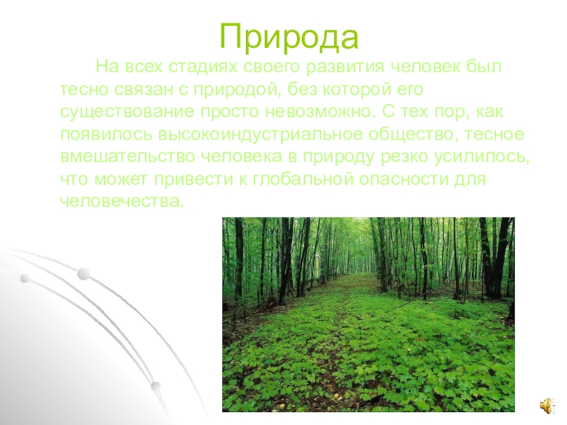 Природа		На всех стадиях своего развития человек был тесно связан с природой, без которой его существование просто невозможно.