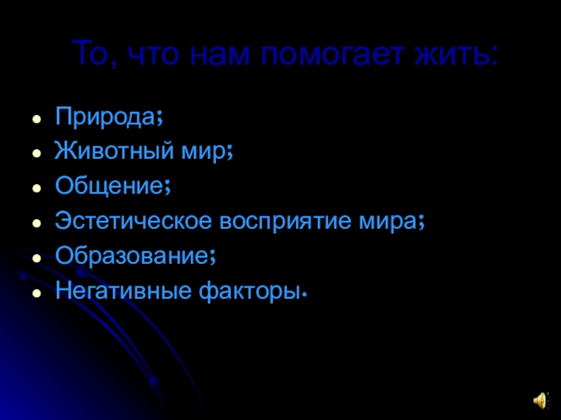 То, что нам помогает жить:Природа;Животный мир;Общение;Эстетическое восприятие мира;Образование;Негативные факторы.