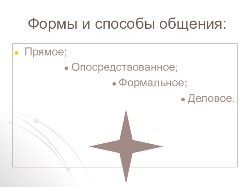 Формы и способы общения:Прямое;Опосредствованное;Формальное;Деловое.