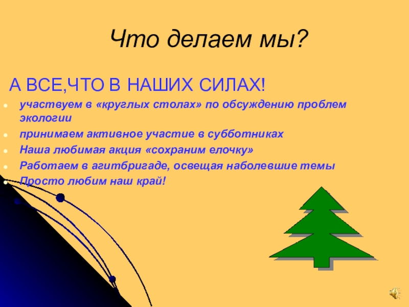 Что делаем мы? А ВСЕ,ЧТО В НАШИХ СИЛАХ!участвуем в «круглых столах» по обсуждению проблем экологиипринимаем активное участие