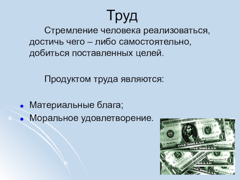 Труд 		Стремление человека реализоваться, достичь чего – либо самостоятельно, добиться поставленных целей.		Продуктом труда являются:Материальные блага;Моральное удовлетворение.