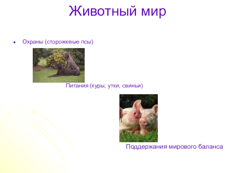 Животный мир		Представители наших четвероногих друзей являются не только «игрушками», но и выступают, как полезные существа, для:Охраны (сторожевые