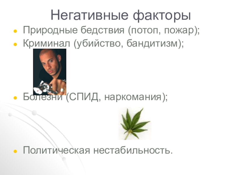 Негативные факторыПриродные бедствия (потоп, пожар);Криминал (убийство, бандитизм);Болезни (СПИД, наркомания);Политическая нестабильность.