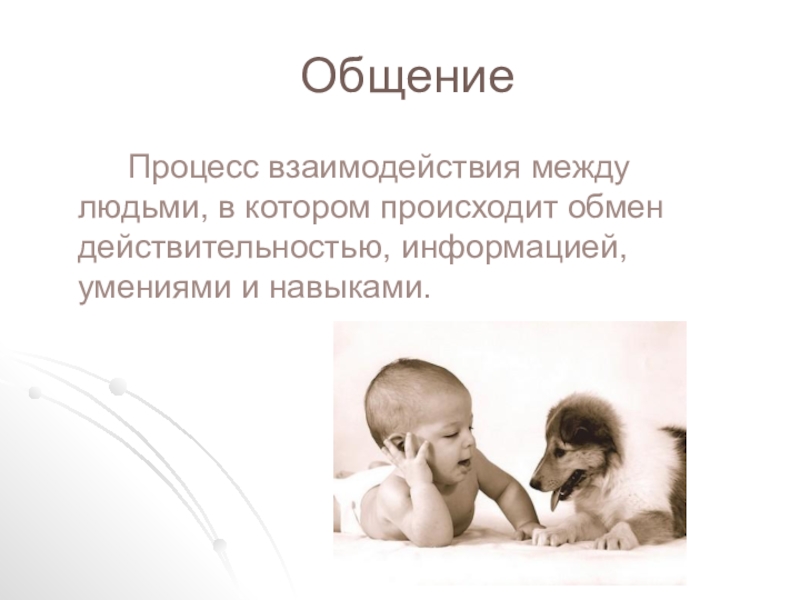 Общение 		Процесс взаимодействия между людьми, в котором происходит обмен действительностью, информацией, умениями и навыками.