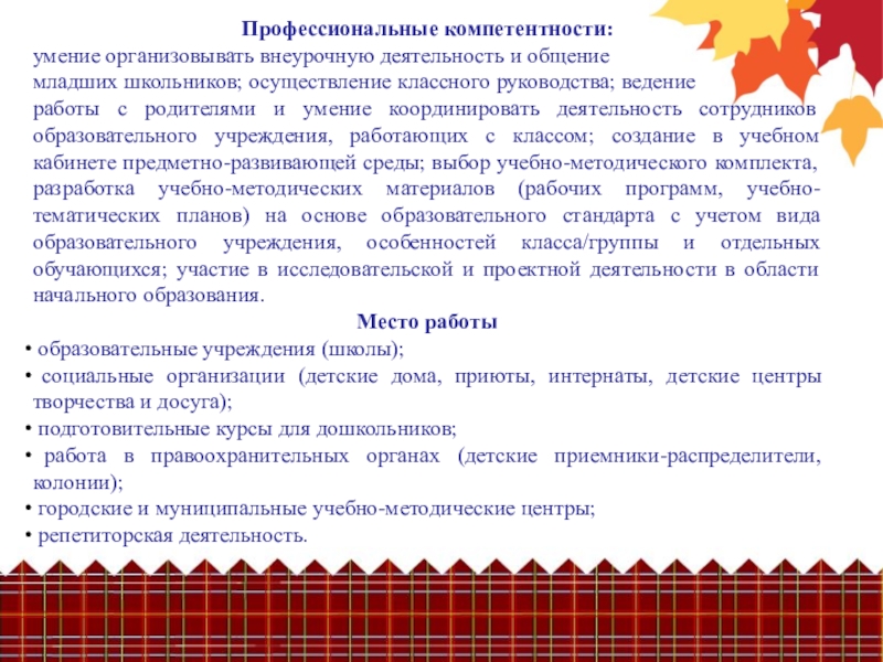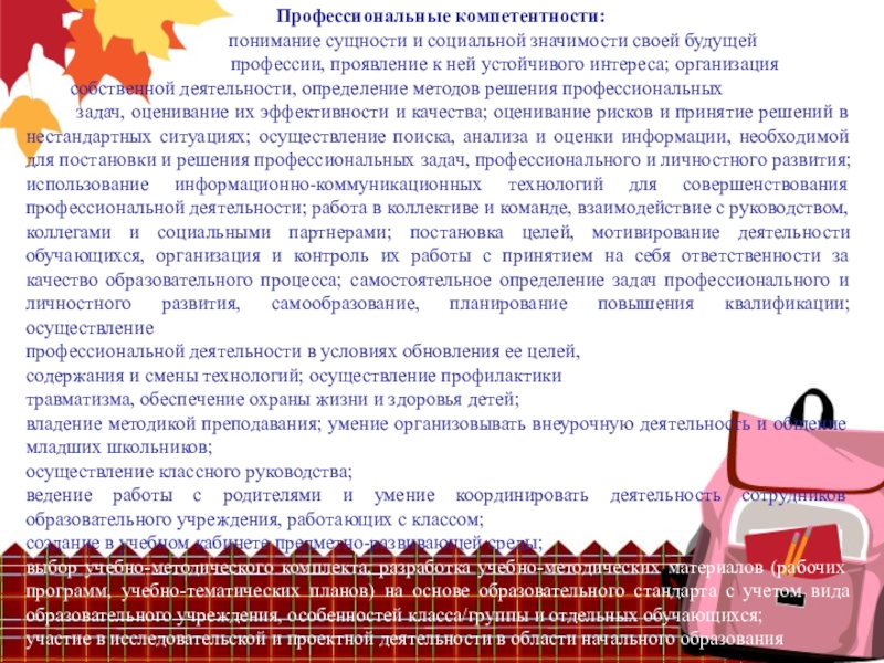работы с родителями и умение координировать деятельность сотрудников образовательного учреждения, работающих с классом; создание в учебном кабинете предметно-развивающей среды; выбор учебно-методического комплекта, разработка учебно-методических материалов (рабочих программ, учебно-тематических планов) на основе образовательного стандарта с учетом вида образовательного учреждения, особенностей класса/группы и отдельных обучающихся; участие в исследовательской и проектной деятельности в области начального образования.