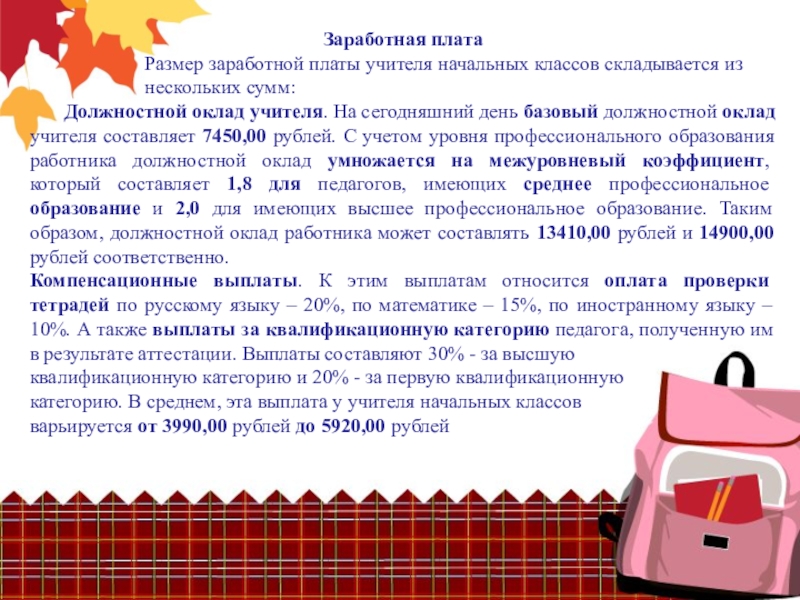 Должностной оклад учителя. На сегодняшний день базовый должностной оклад учителя составляет 7450,00 рублей. С учетом уровня профессионального образования работника должностной оклад умножается на межуровневый коэффициент, который составляет 1,8 для педагогов, имеющих среднее профессиональное образование и 2,0 для имеющих высшее профессиональное образование. Таким образом, должностной оклад работника может составлять 13410,00 рублей и 14900,00 рублей соответственно.