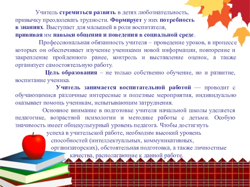 Основное внимание в подготовке учителя начальной школы уделяется педагогике, возрастной психологии и методике работы с детьми. Особую значимость имеет общекультурный уровень педагога. Чтобы достигнуть