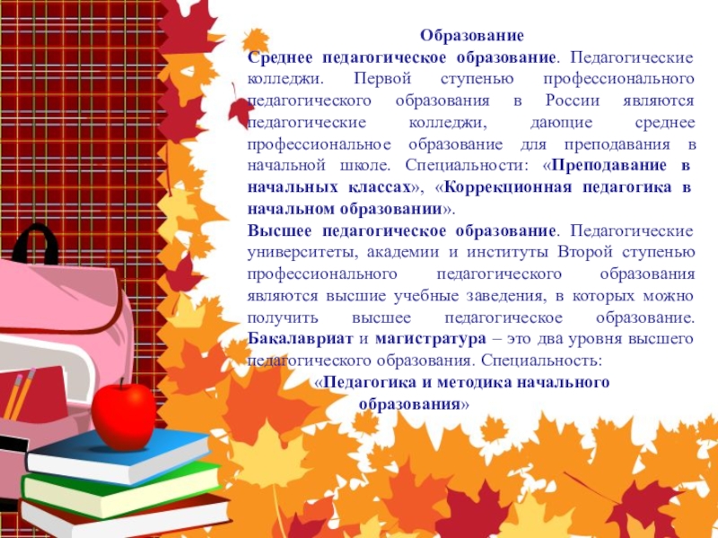 России являются педагогические колледжи, дающие среднее профессиональное образование для преподавания в начальной школе. Специальности: «Преподавание в начальных классах», «Коррекционная педагогика в начальном образовании».