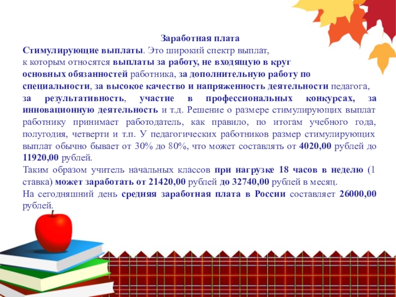 за результативность, участие в профессиональных конкурсах, за инновационную деятельность и т.д. Решение о размере стимулирующих выплат работнику принимает работодатель, как правило, по итогам учебного года, полугодия, четверти и т.п. У педагогических работников размер стимулирующих выплат обычно бывает от 30% до 80%, что может составлять от 4020,00 рублей до 11920,00 рублей.