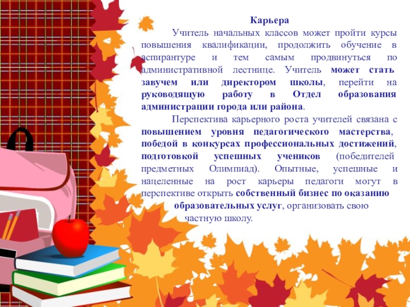 квалификации, продолжить обучение в аспирантуре и тем самым продвинуться по административной лестнице. Учитель может стать завучем или директором школы, перейти на руководящую работу в Отдел образования администрации города или района.