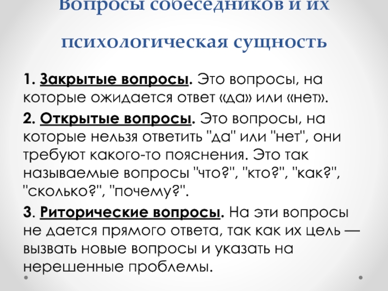 Слайд 13Вопросы собеседников и их психологическая сущность