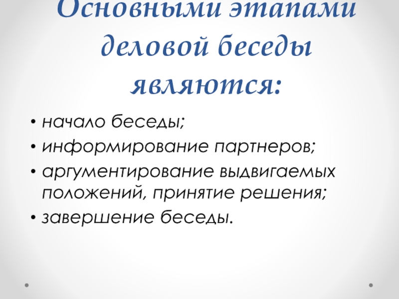Слайд 7Основными этапами деловой беседы являются: