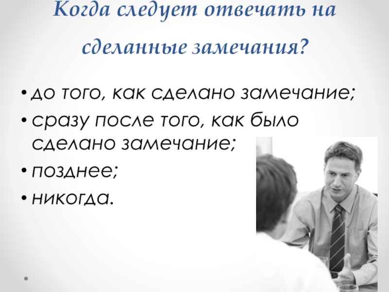 Слайд 18Когда следует отвечать на сделанные замечания?