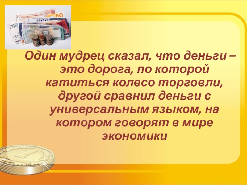 катиться колесо торговли, другой сравнил деньги с универсальным языком, на котором говорят в мире экономики