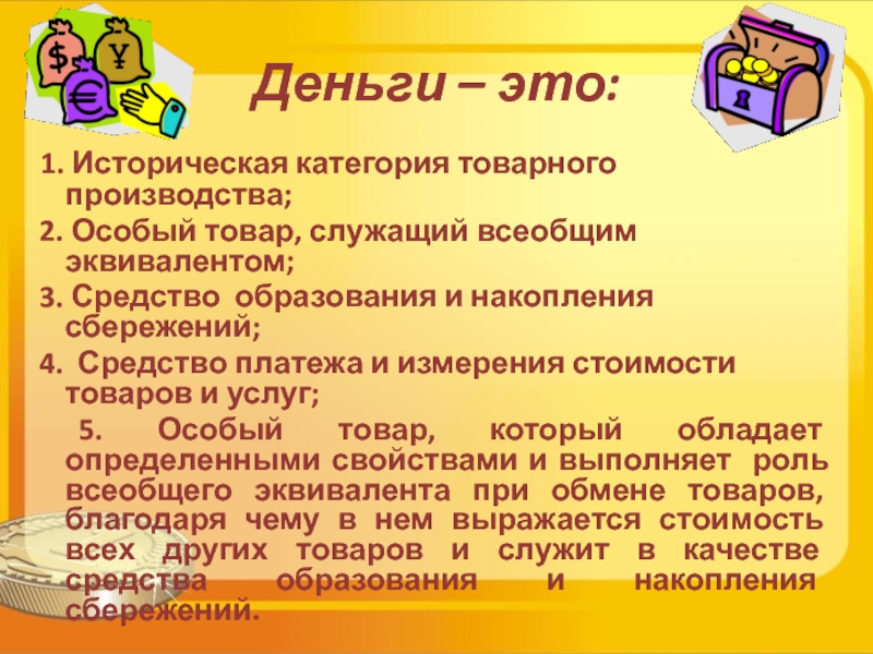 Деньги – это: 1. Историческая категория товарного производства; 2. Особый товар, служащий всеобщим эквивалентом; 3. Средство образования