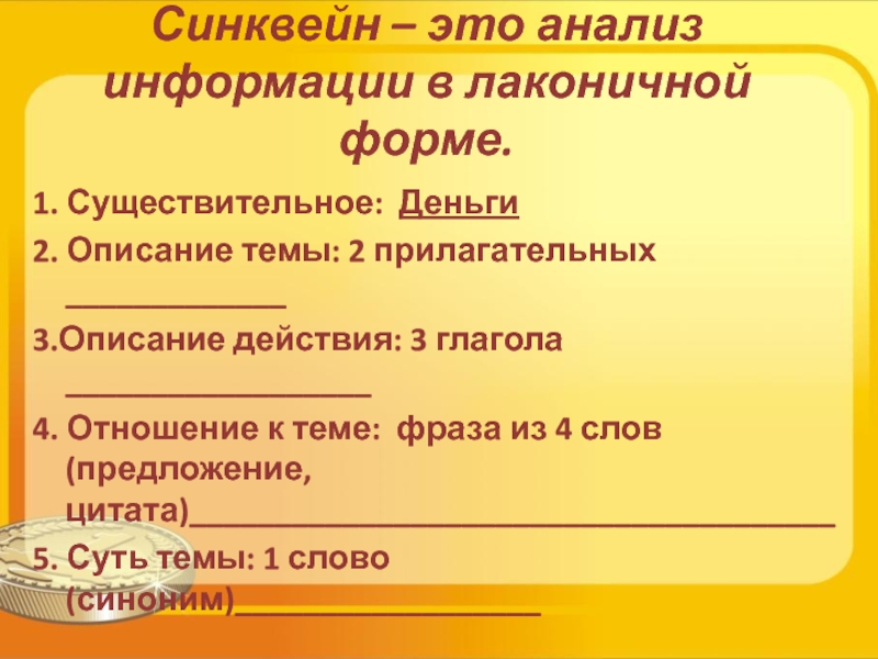 Синквейн – это анализ информации в лаконичной форме.1. Существительное: Деньги2. Описание темы: 2 прилагательных _____________3.Описание действия: 3