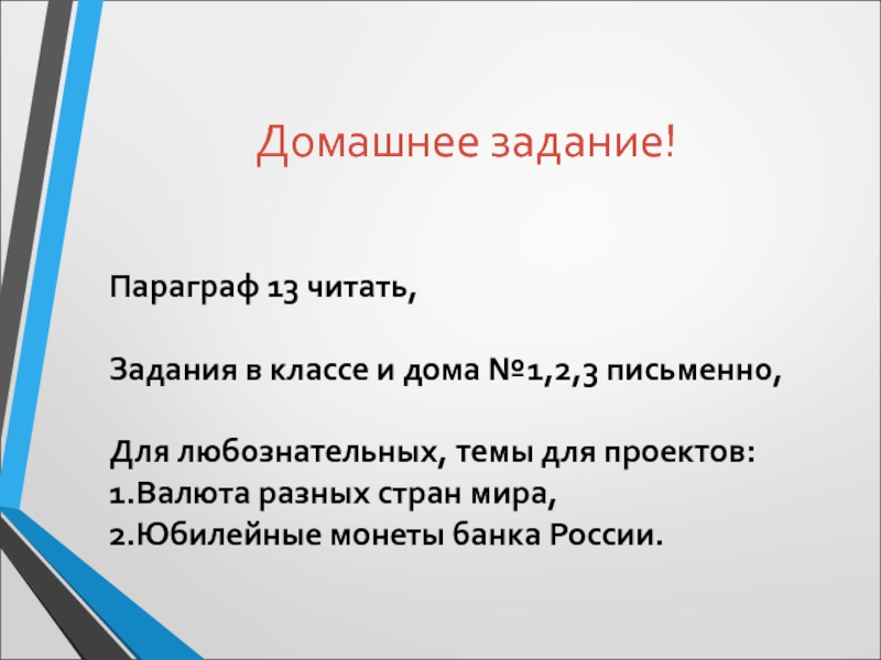 Домашнее задание!Параграф 13 читать, Задания в классе и дома №1,2,3 письменно,Для любознательных, темы для проектов:1.Валюта разных стран