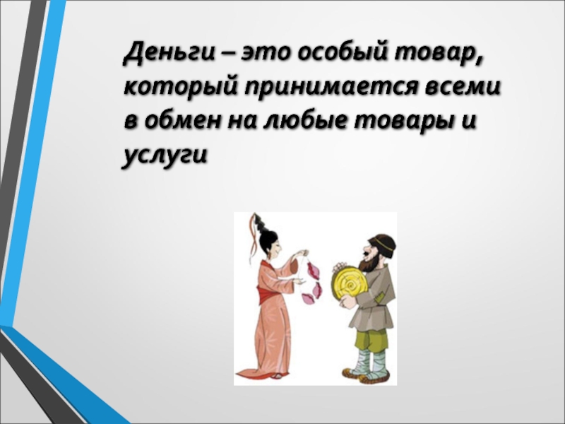 Слайд 8Деньги – это особый товар, который принимается всеми в обмен на