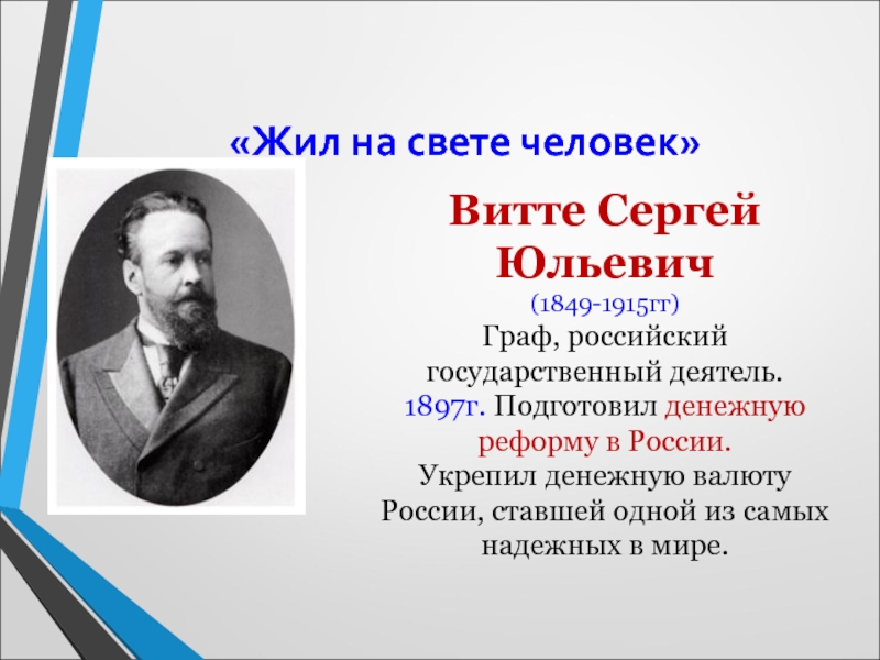 «Жил на свете человек»Витте Сергей Юльевич(1849-1915гг)Граф, российский государственный деятель.1897г. Подготовил денежную реформу в России.Укрепил денежную валюту России,