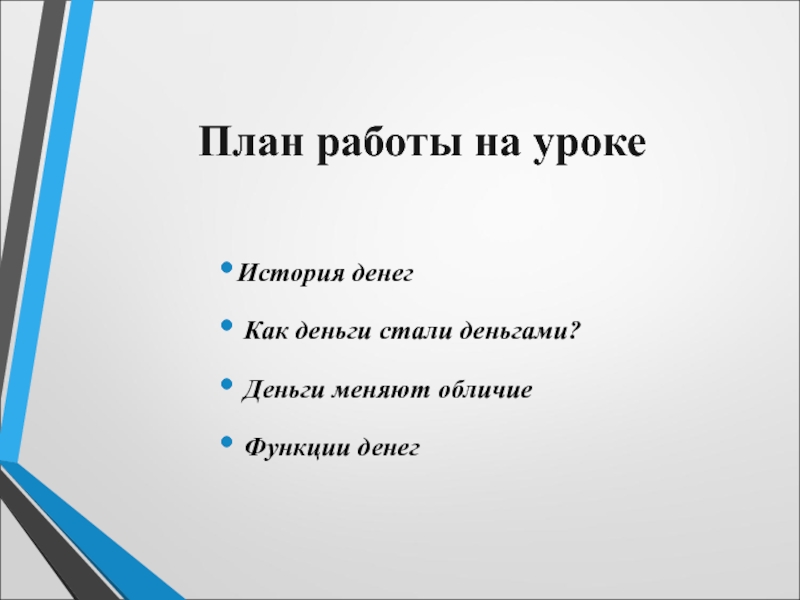 План работы на уроке История денег Как деньги стали деньгами? Деньги меняют обличие Функции денег