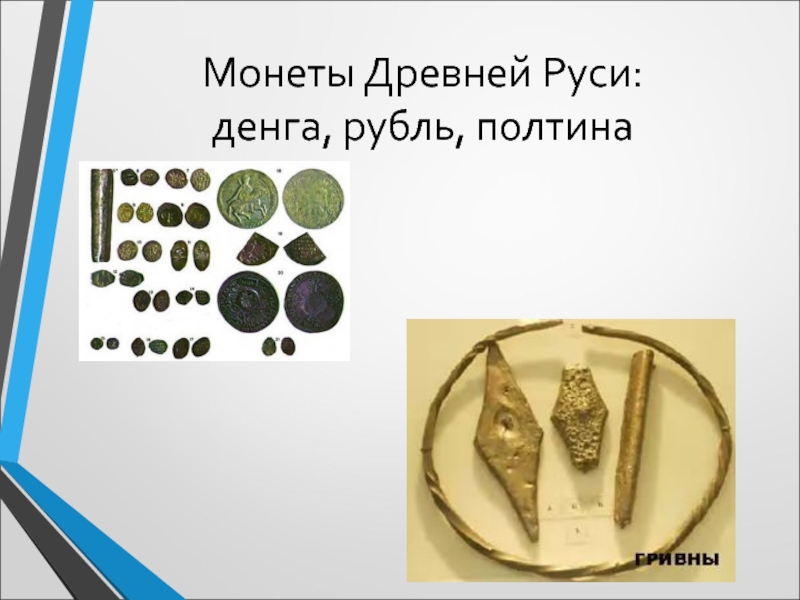 Слайд 13Монеты Древней Руси: денга, рубль, полтина