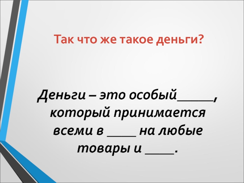 Так что же такое деньги?Деньги – это особый_____, который принимается всеми в ____ на любые товары и