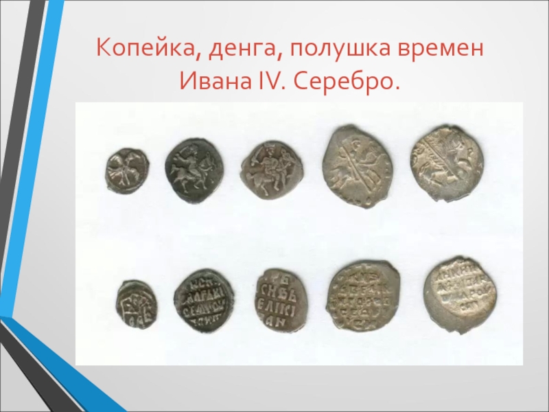 Слайд 14Копейка, денга, полушка времен Ивана IV. Серебро.