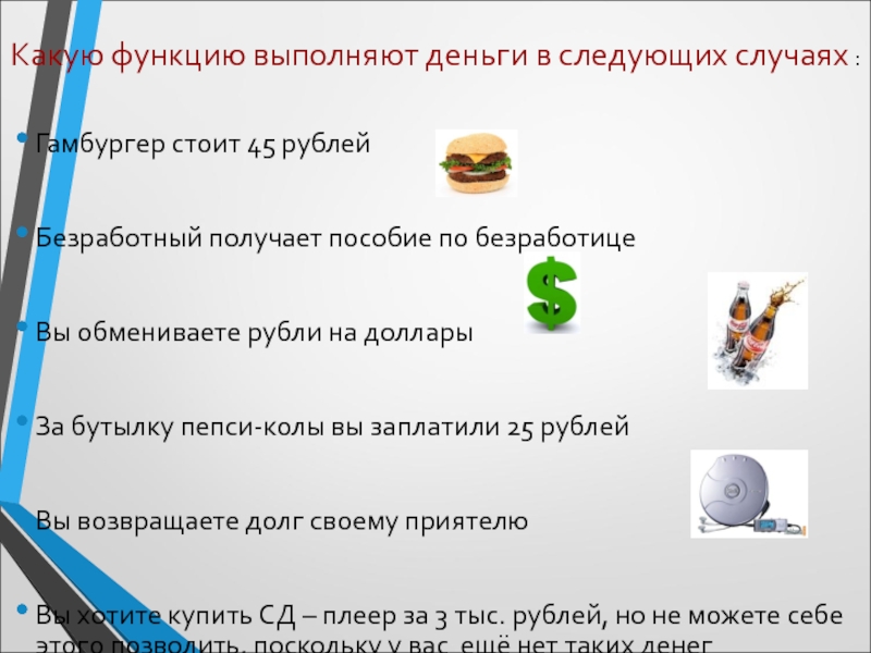Какую функцию выполняют деньги в следующих случаях :Гамбургер стоит 45 рублей
