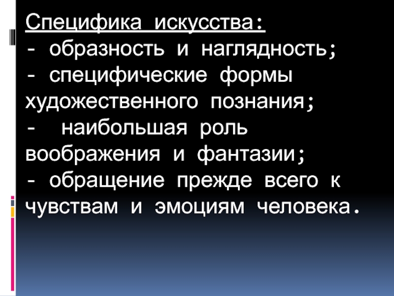 Специфика искусства: - образность и наглядность; - специфические формы художественного познания; - наибольшая роль воображения и фантазии;