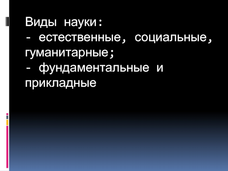 Слайд 14Виды науки: - естественные, социальные, гуманитарные; - фундаментальные и прикладные