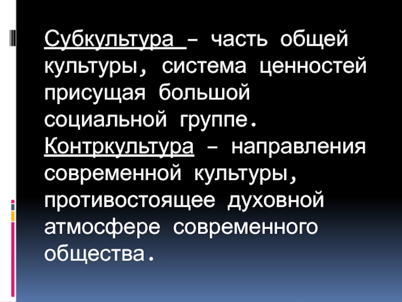 Субкультура – часть общей культуры, система ценностей присущая большой социальной группе. Контркультура – направления современной культуры, противостоящее