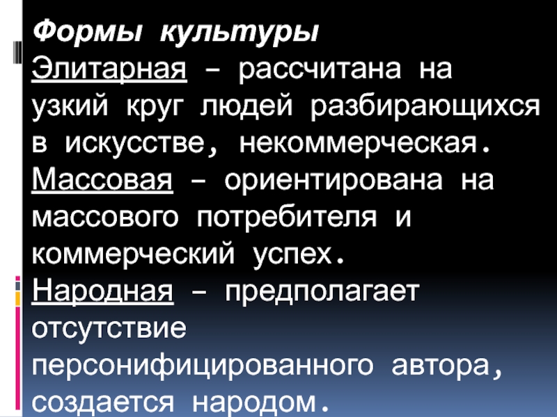 Формы культуры Элитарная – рассчитана на узкий круг людей разбирающихся в искусстве, некоммерческая. Массовая – ориентирована на