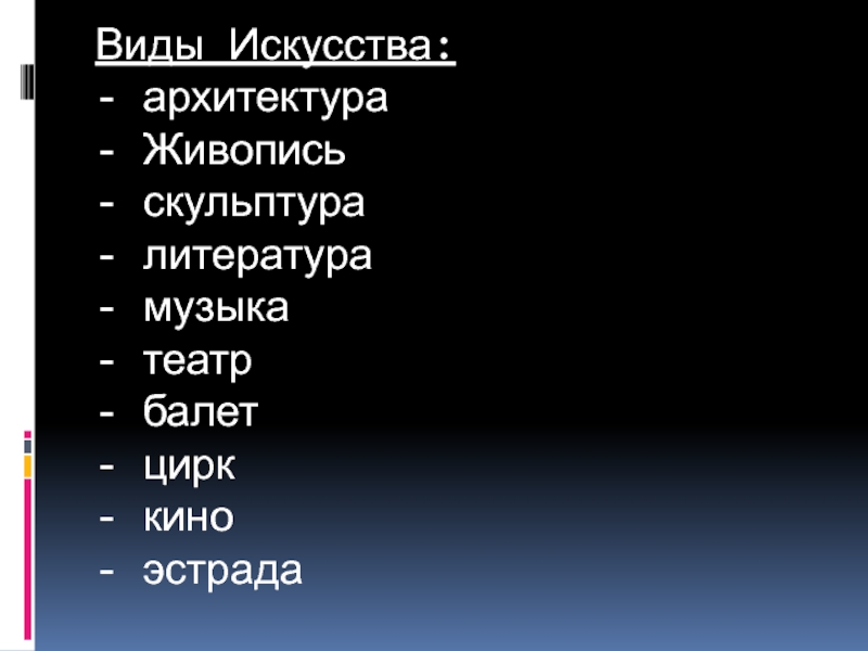 Виды Искусства: - архитектура - Живопись - скульптура - литература - музыка - театр - балет -