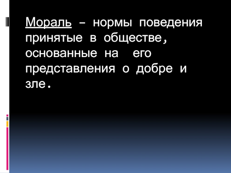 Слайд 26Мораль – нормы поведения принятые в обществе, основанные на его представления