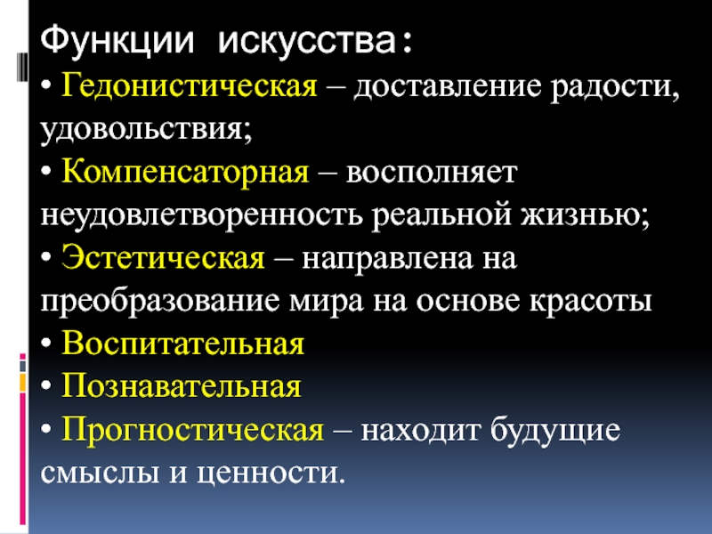 Функции искусства: • Гедонистическая – доставление радости, удовольствия; • Компенсаторная – восполняет неудовлетворенность реальной жизнью; • Эстетическая