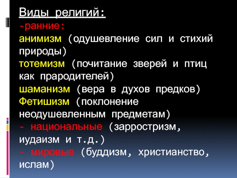 Виды религий: -ранние:  анимизм (одушевление сил и стихий природы) тотемизм (почитание зверей и птиц как прародителей)