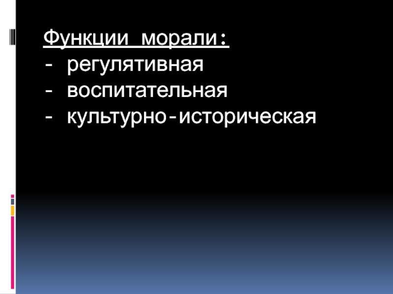 Слайд 27Функции морали: - регулятивная - воспитательная - культурно-историческая