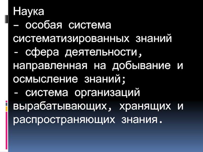 Наука  – особая система систематизированных знаний - сфера деятельности, направленная на добывание и осмысление знаний; -